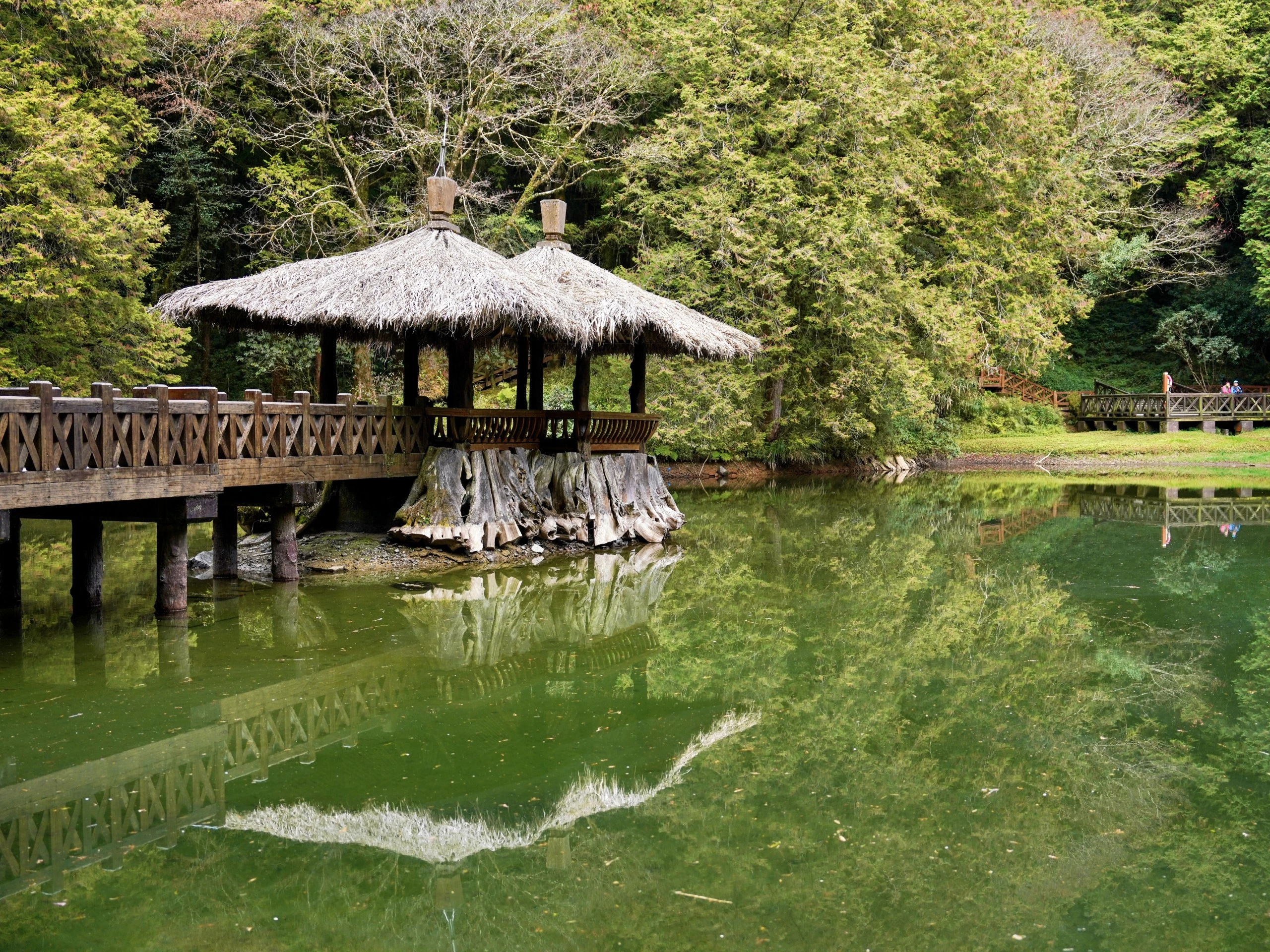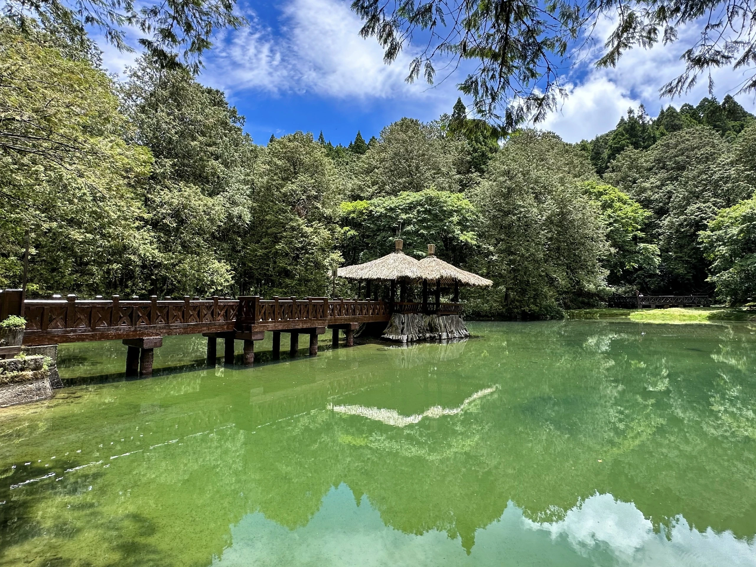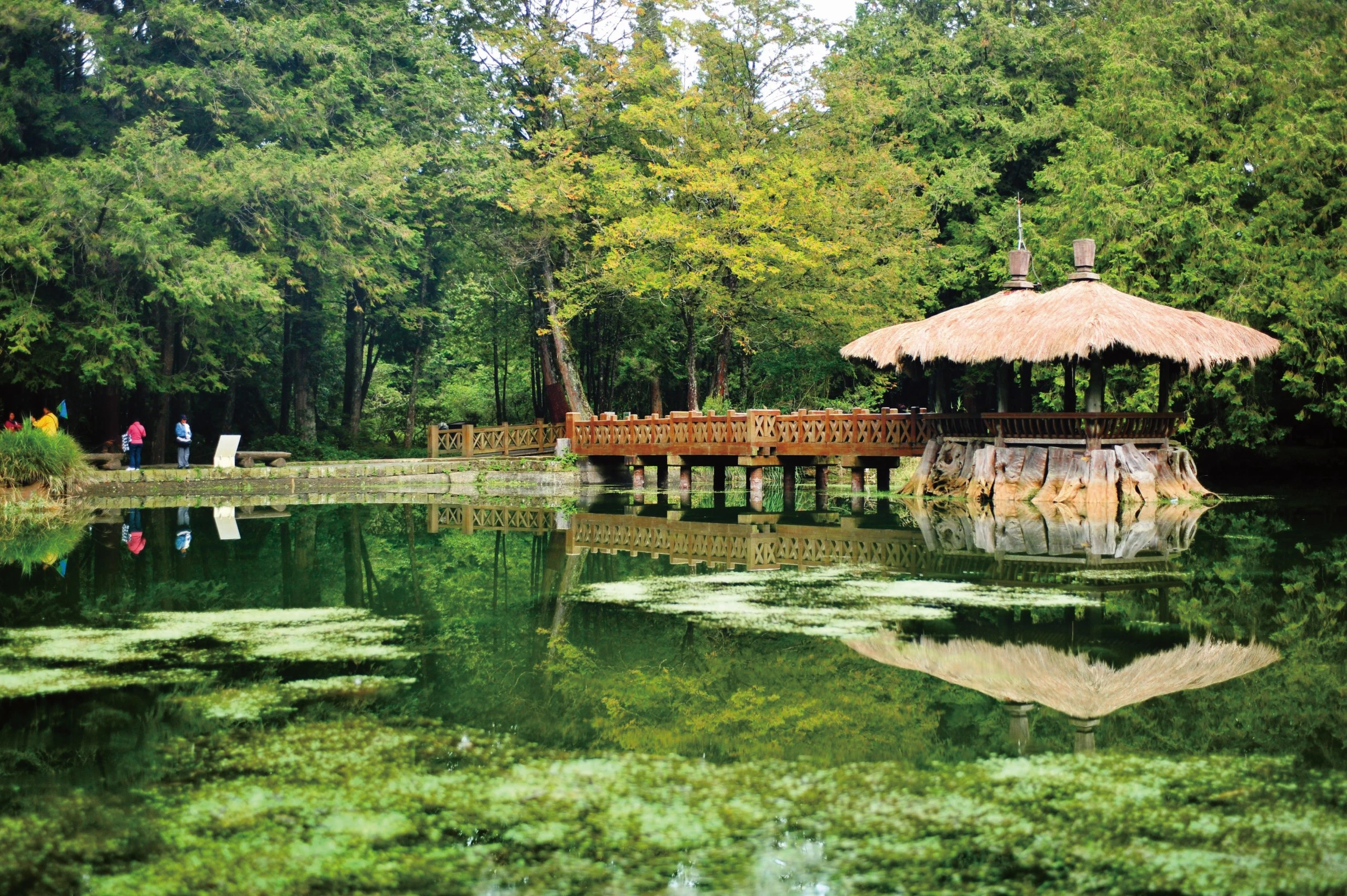 阿里山的姐妹潭,是兩個剛好生在一起、大小不一的高山湖泊。傳說過去山中有一對姐妹,因為同時愛上一名男子,卻不願傷害手足之情,於是雙雙投潭自盡,殞命在姐潭和妹潭中。伴隨著這樣悽美的愛情故事,使得姐妹潭聲名大噪。後人便在姐潭上,利用檜木大樹的根頭,矗立在水面作為基座,在上面建立了兩座相思亭,以木橋和岸邊相聯結,並在外圍築起全長180公尺的環潭步道。 姐潭略呈長方形,佔地約160坪;妹潭則略呈圓形,佔地約20坪。兩座天然水池都已經開發了數十年,潭水清澈無波,宛如明鏡,是阿里山森林風景區的重要景點。尤其當潭水飽滿時,總是讓許多遊客留連忘返,靜謐的氣氛,加上飛躍於碧綠潭水間的魚群,讓人湧現思古之悠情。然而,台灣近年來持續乾旱,姐妹潭在民國91年首次乾涸見底,水源涵養能力汲汲可危。遊客前往觀賞時,不妨多加留意姐妹潭周遭生態區的變化,若是遇見潭水豐潤之期,則更能體會其珍貴的美景了。