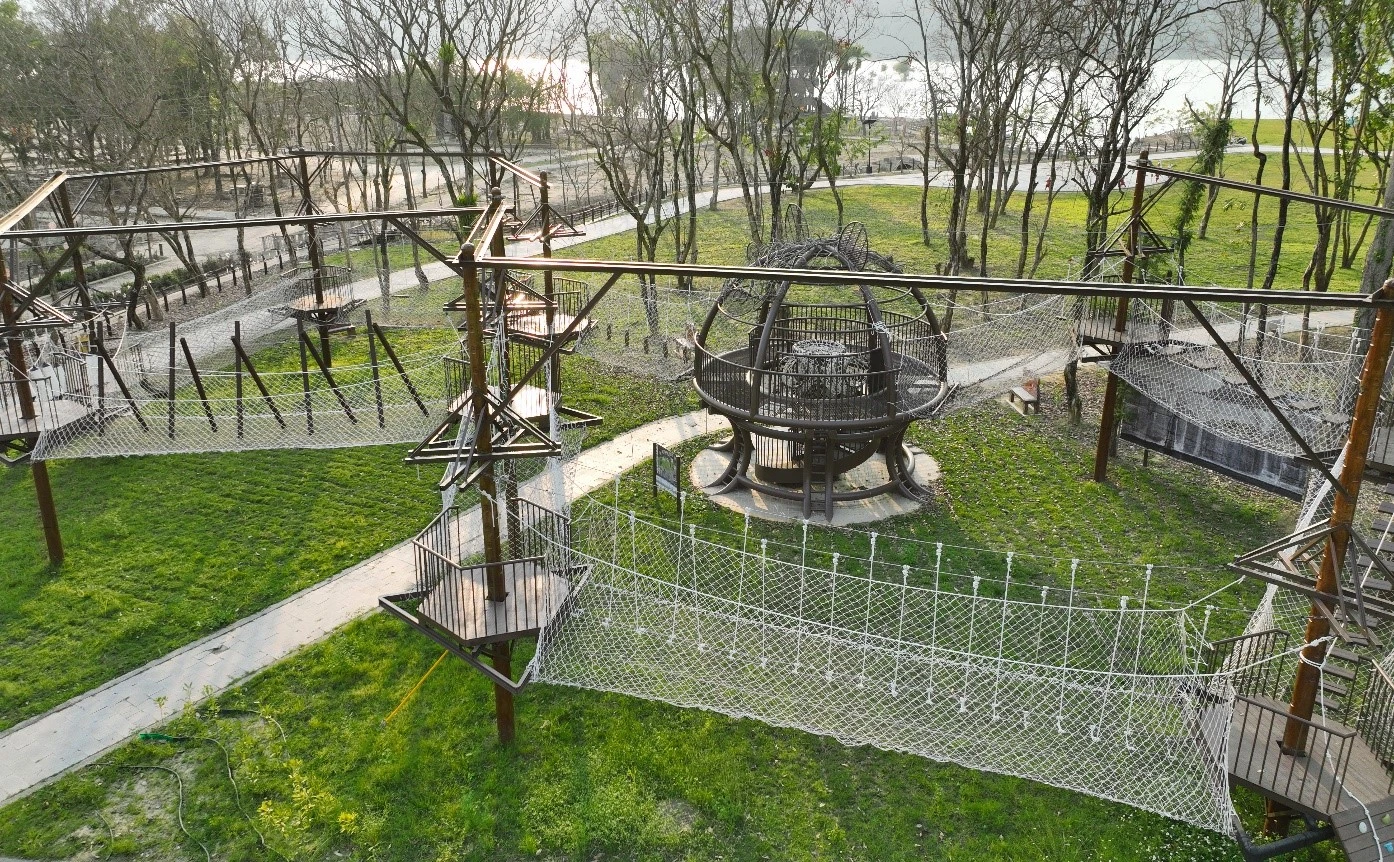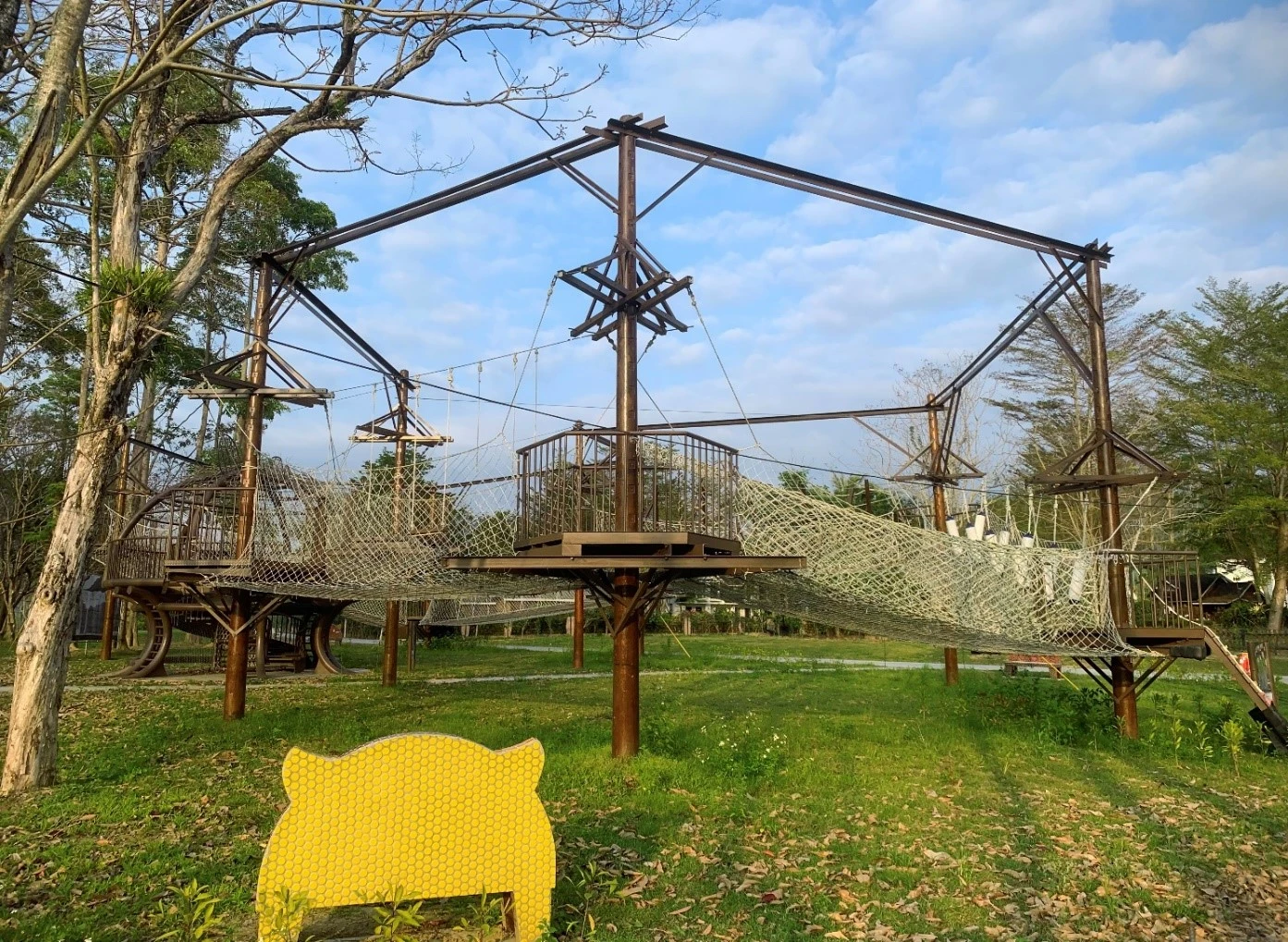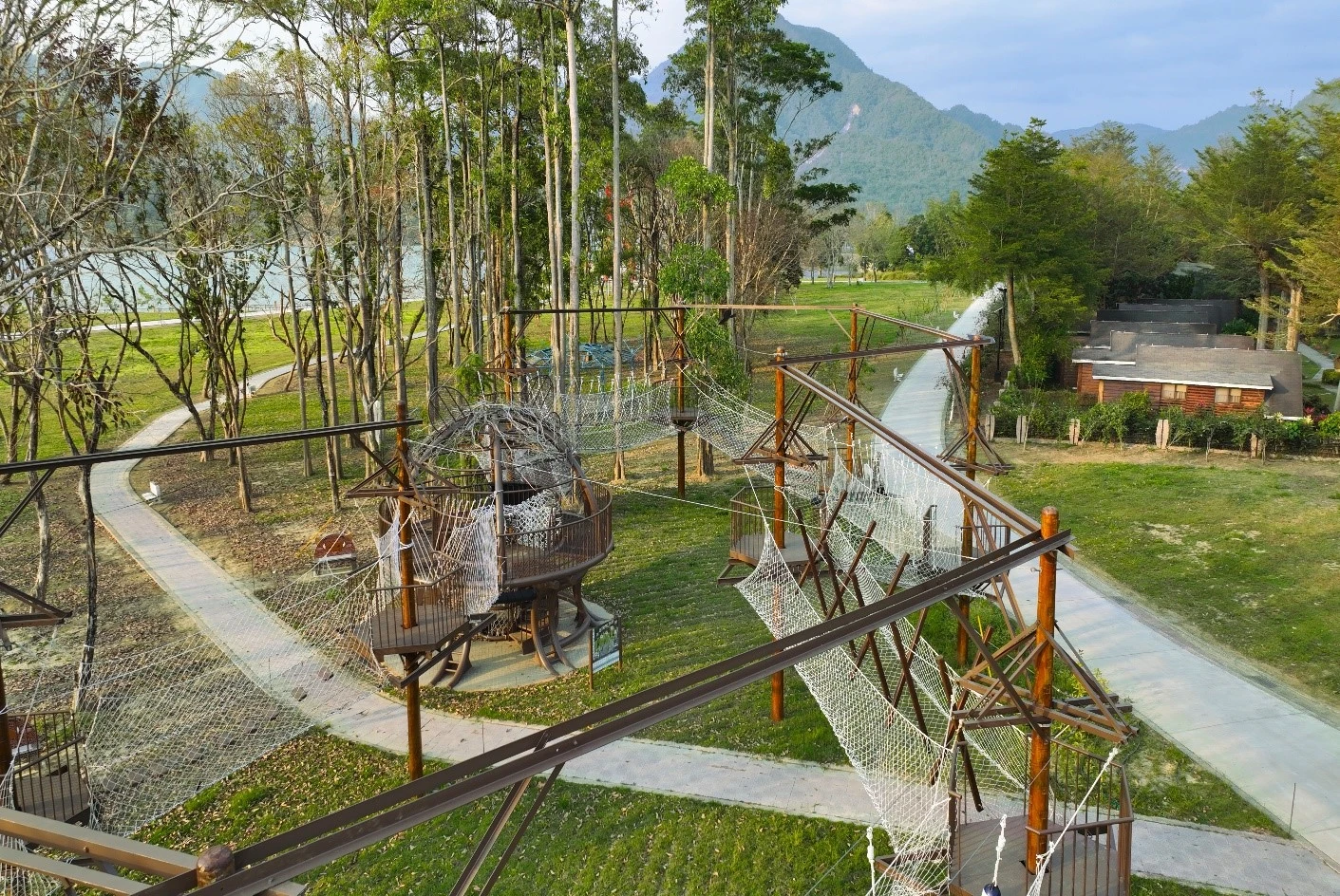 滿水位的曾文水庫如一面巨大的天然湖鏡,環繞著層層山巒,孕育出飛鷹峽谷、山豬島、情人公園等多處秘境景點。這些景點星羅棋布於水域與山坡之間,彼此以吊橋銜接或搭乘遊艇前往,形成猶如「跳島式」的旅遊動線。旅人乘船穿梭於山水之間,再轉換至空中吊橋或高空平台,不僅打破傳統陸路限制,更展現出山林旅遊的機動性與趣味性,開啟探索山城的多重感官經驗。 順應這樣的地形特性與動線設計,園區核心規劃了結合自然地貌的「山訓體驗場」,以最小擾動方式架構高空繩網與六角平台,並導入模擬山林冒險的多樣化路線。整體設施符合ACCT、PRCA國際設置標準與通過PATAIWAN認證,確保挑戰安全,適合兒少五感發展與跨齡遊憩體驗。旅人在行經山湖跳島秘境後,最終來到這座融合林間高度與地形挑戰的體訓場,讓身體與自然對話,從遊戲中學習、從行動中覺察,實現人與自然共學共遊的願景。
