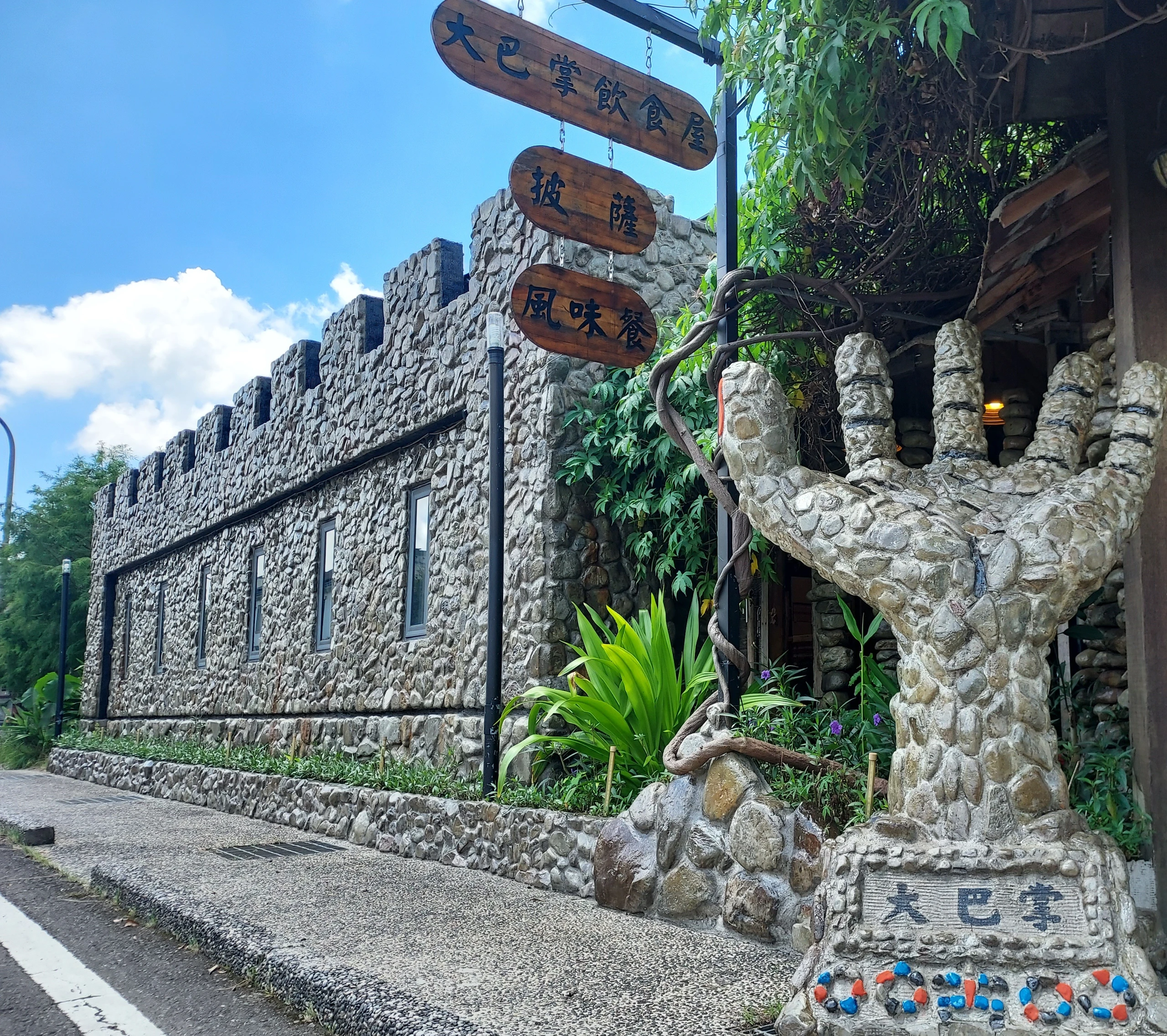 就一把陽傘、一張餐桌和一個烤箱,從「一個巴掌大」的披薩起家,不管晴天雨天,有沒有客人,堅持每天一點一滴地經營,漸漸地找出屬於《大巴掌》的味道~在創業的過程中,把一個自家門口擺設的小攤位,創造出今天一個石頭城堡樣式的餐館。主要提供原住民特色的燒烤料理及手作披薩。