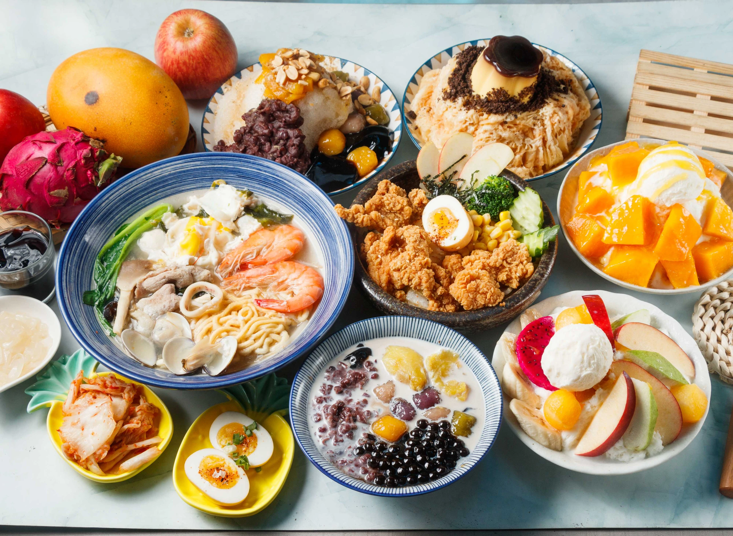 這裡不只是餐廳,更是結合美食與生活興趣的空間。熱食主打「鍋燒麵」,湯頭鮮美、料多實在,有肉肉爆表、蝦爆、蛤爆等選擇。最受矚目的「浮誇魷魚鍋燒」,整隻魷魚搭配蝦子、蛤蠣與海鮮,霸氣澎湃,是海鮮控必點的痛風餐。喜歡乾麵的客人,可選用讚岐烏龍麵的丼麵系列,壽喜燒炒洋蔥搭配牛肉或豬肉香氣十足,也有厚切豬排、魚排展現日式風味,更有韓式泡菜、辣醬與水波蛋的創意組合。 冰品部分嚴選當季水果製成果磚,搭配新鮮水果,清爽消暑;古早味冰品則能自選紅豆、蜜鳳梨、蜜地瓜等手工熬煮配料,還有滑嫩的仙草,冰涼爽口,甜而不膩,帶來純樸又療癒的滋味。 老闆的理念是:「雞蛋不能放在同一個籃子裡,但興趣可以。」因此店內除了美食,還融合綠意植栽、可愛爬蟲與精緻微縮場景,都是老闆與老闆娘的興趣展現。來到這裡,不僅能享用澎湃餐點,也能感受用心營造的獨特氛圍。