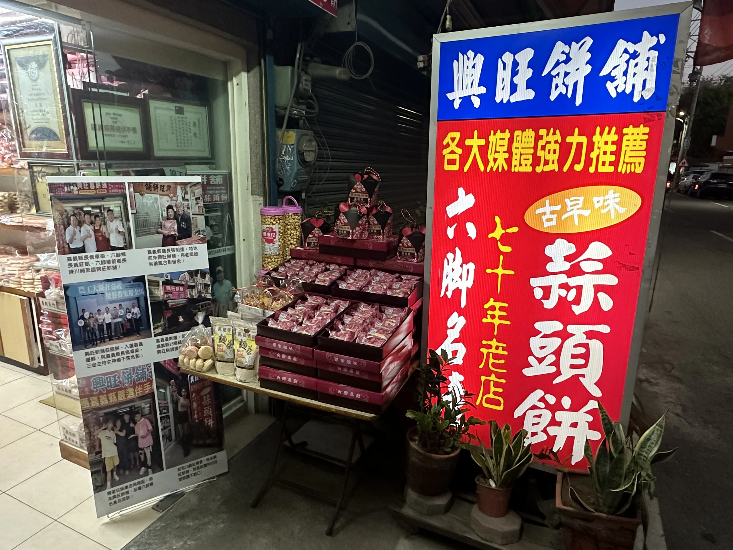 「興旺餅舖」創立於民國37年3月1日(西元1948年),是由嘉義六腳鄉 黃傳先生所創立的,而製作出的蒜頭餅是以單純、樸實的原則去呈現,也可以品味出台灣民初時期的風土民情。 本店為興旺餅舖,位於嘉義縣六腳鄉蒜頭村蒜頭市場內,恰好是亞洲搖滾天王「伍佰」舊居的隔壁,創始於西元1948年距今已有60餘年歷史,從祖父、父親、到我以及下一代的兒子,已傳承至第四代至今擁有一甲子的製餅經驗也都一貫秉持著,70年老店傳統食品不加人工色素,不加防腐劑,全程純手工製作,當中又以「蒜頭餅」最具代表性,「蒜頭餅」吃起來的口感酥酥脆脆,當中還有一股甘甜的蒜頭味道,採用上等食材以及遵循古法製作,蒜頭餅類似老婆餅純粹由蒜頭做成的,加入獨特蒜頭香味讓人吃了會留齒蒜香,而我們做的「蒜頭餅」都由純手工製作,不含防腐劑色素,讓大家吃的健康又安心。 「蒜頭餅」也因地名及口感特殊罕見,被譽為六腳鄉名產又稱回鄉餅,而本店興旺餅舖也是六腳鄉「蒜頭餅」創始老店。 另本店還有純手工古早原味喜餅 冬瓜肉餅.魯肉豆沙.水晶餅.麻糬餅.鳳梨椰果.狀元餅.龍鳳對餅等各種喜餅,歡迎訂購全省宅配送達。