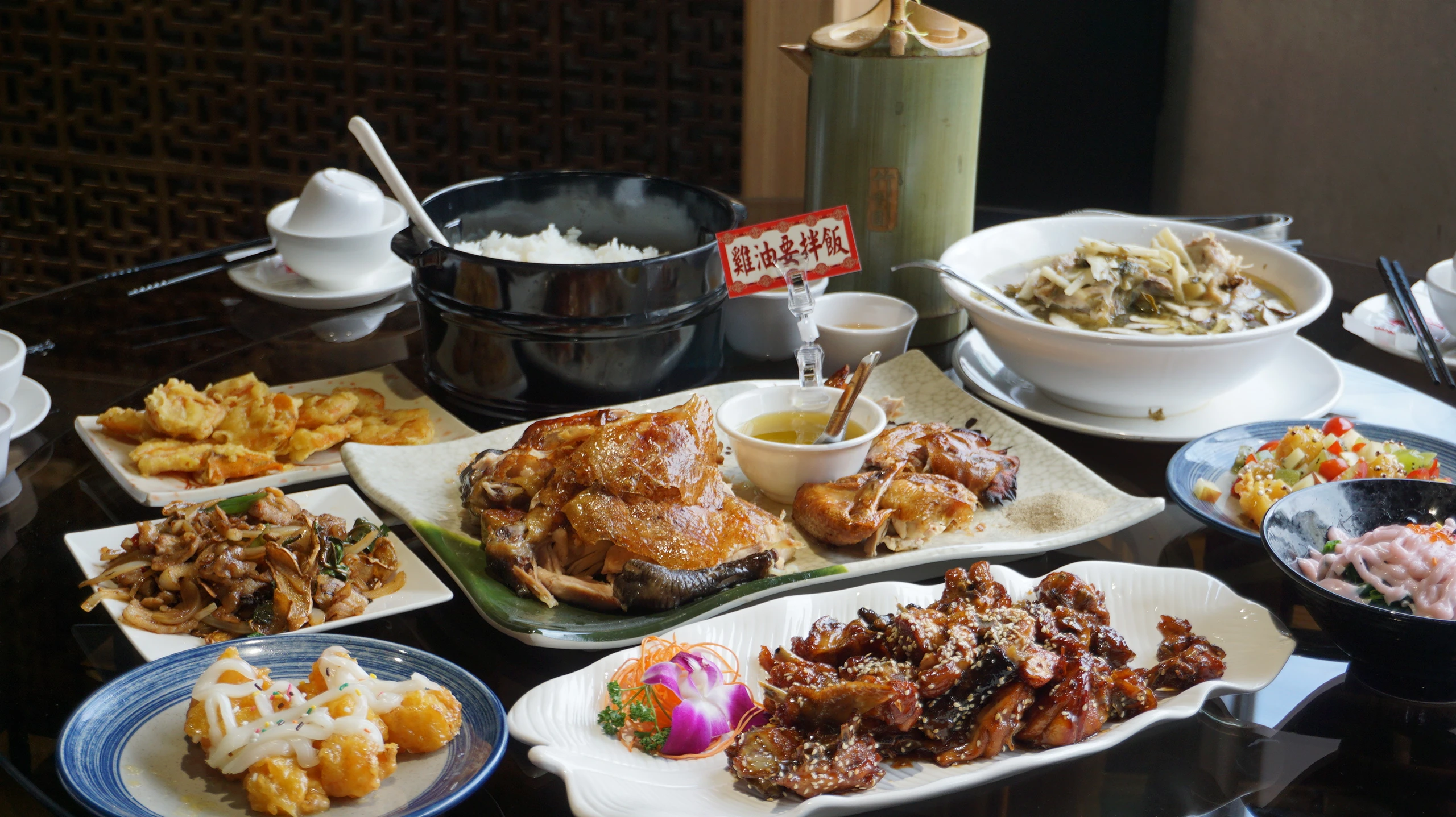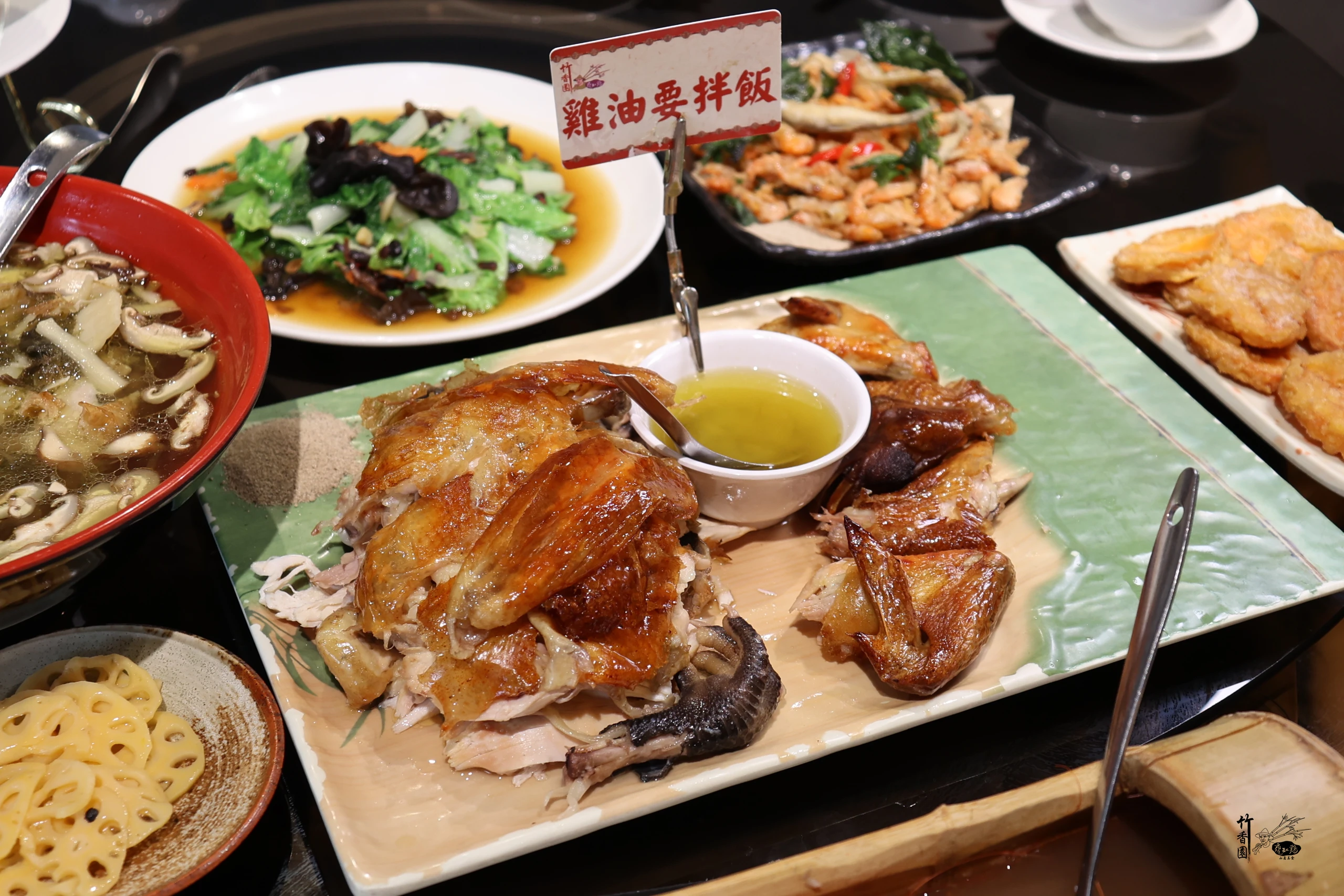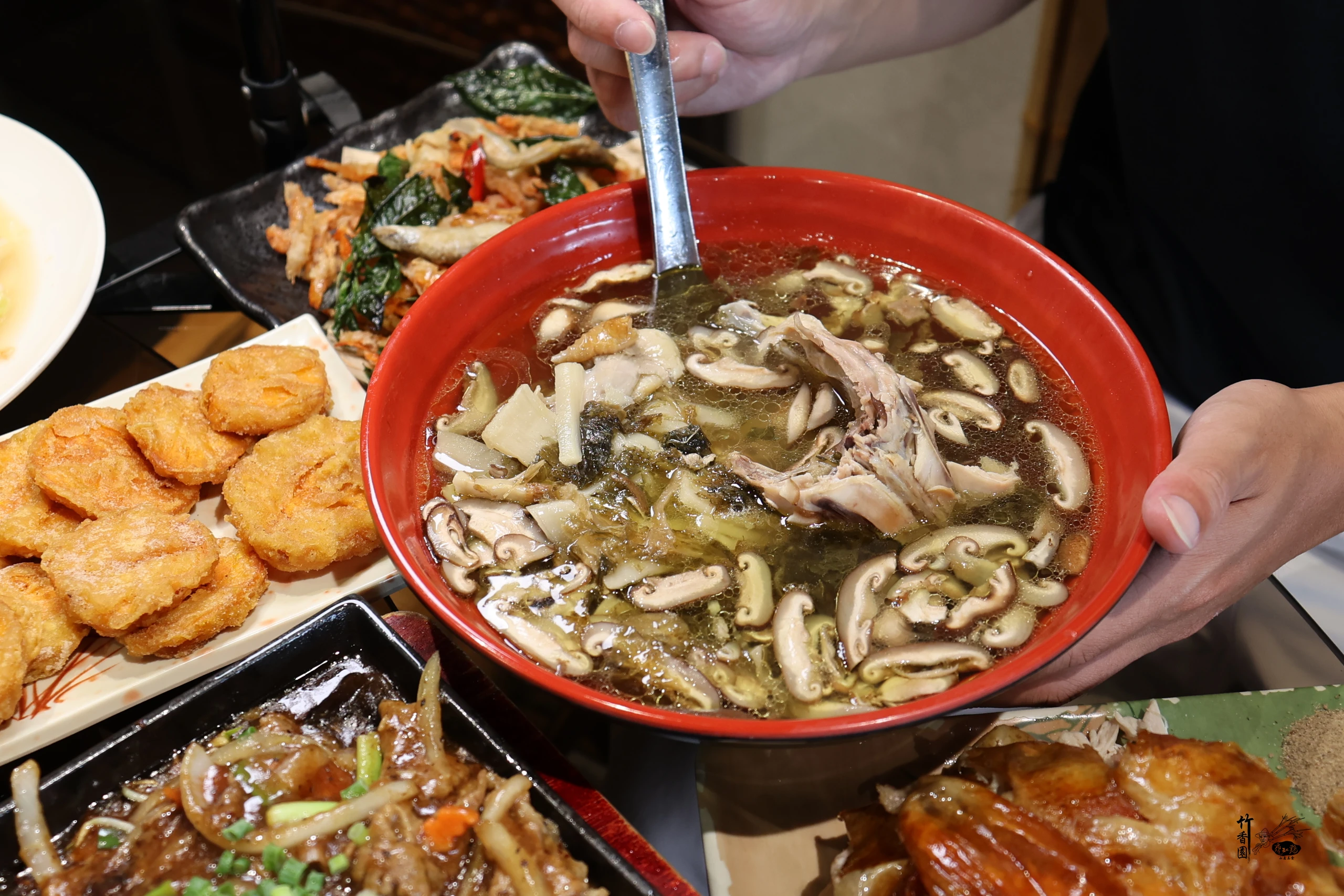 甕缸雞: 我們的甕缸雞是採用黑羽毛正土雞足足3斤的黑羽毛正土雞,入陶甕烘烤40分,全雞歷經慢火悶烤,每一口都鎖住精華,外皮酥脆,肉質鮮嫩多汁。 香菇雞油脆筍湯: 甕缸雞上桌前,貼心服務幫客人手剝好後上桌,還會附最主要的湯底,以雞架子融合阿里山的脆筍跟福菜搭配配的高湯,呈現這一整隻雞最原始獨特的風味給客人享用。 其他人氣招牌菜色像是紫蘇梅子雞、塔香山豬肉、藍莓優格過貓、乾鍋山豬肉、鹹蛋山苦瓜等都是到店必點。 用餐環境: 餐廳採用大量天然竹材設計,空間通透、充滿禪意,讓人置身於山林般的氛圍中用餐,遠離塵囂、身心放鬆。以竹為屋、以火為魂、以雞為藝,這裡不只是吃一頓飯,而是走進一場視覺與味覺的療癒之旅。「吃一隻雞,聞一身竹香」只有在竹香園,才能體驗的食藝饗宴。