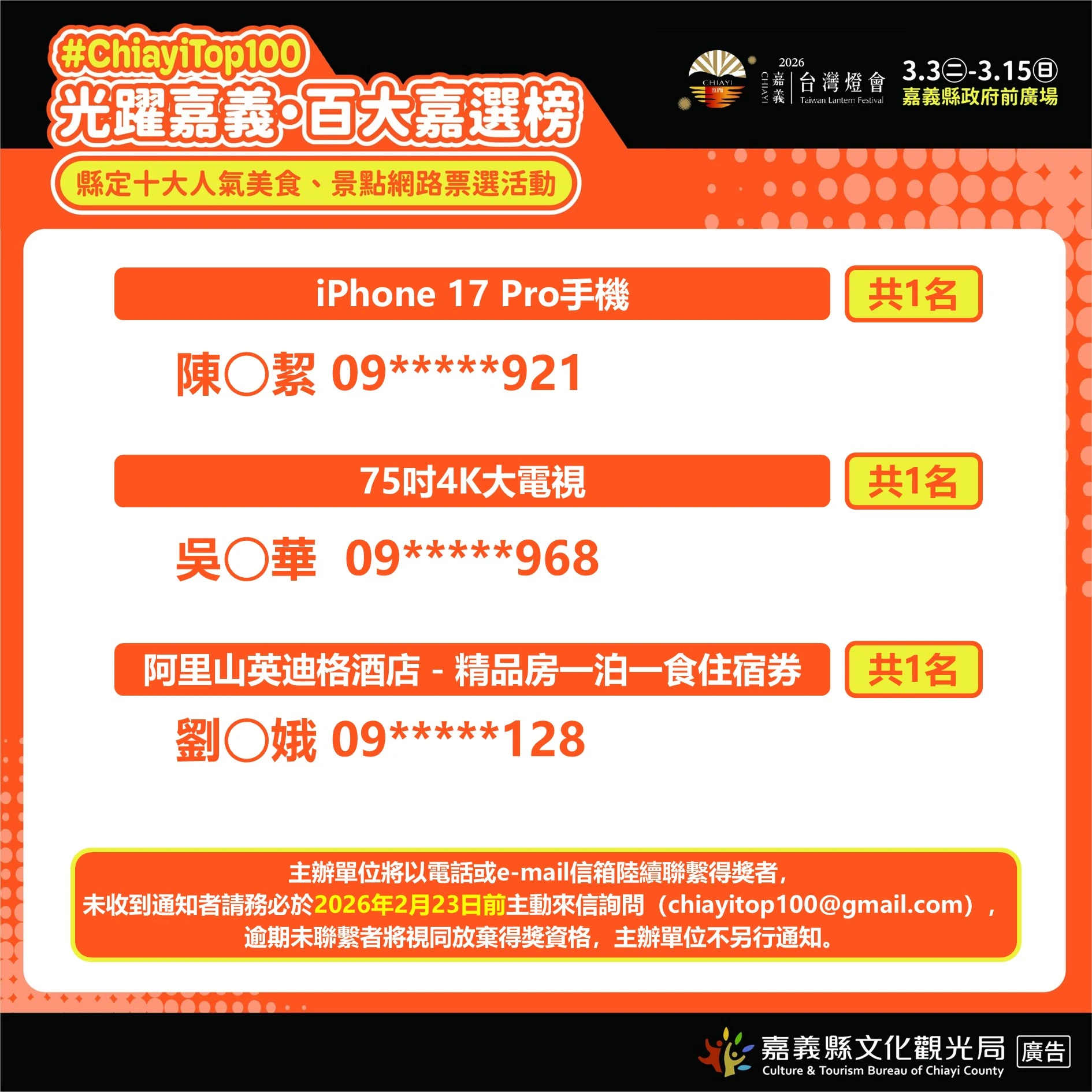 1.領獎通知:主辦單位將以電話或e-mail信箱陸續聯繫得獎者,說明領獎事宜及寄送領獎所需填寫之相關文件。未收到通知者,請務必於2026年2月23日前主動來信詢問(chiayitop100@gmail.com),以e-mail發信時間為憑,逾期未聯繫者將視同放棄得獎資格,主辦單位不另行通知。